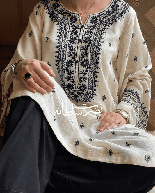 Off white and Black Handmade Irish Lawn Kurta - Pret