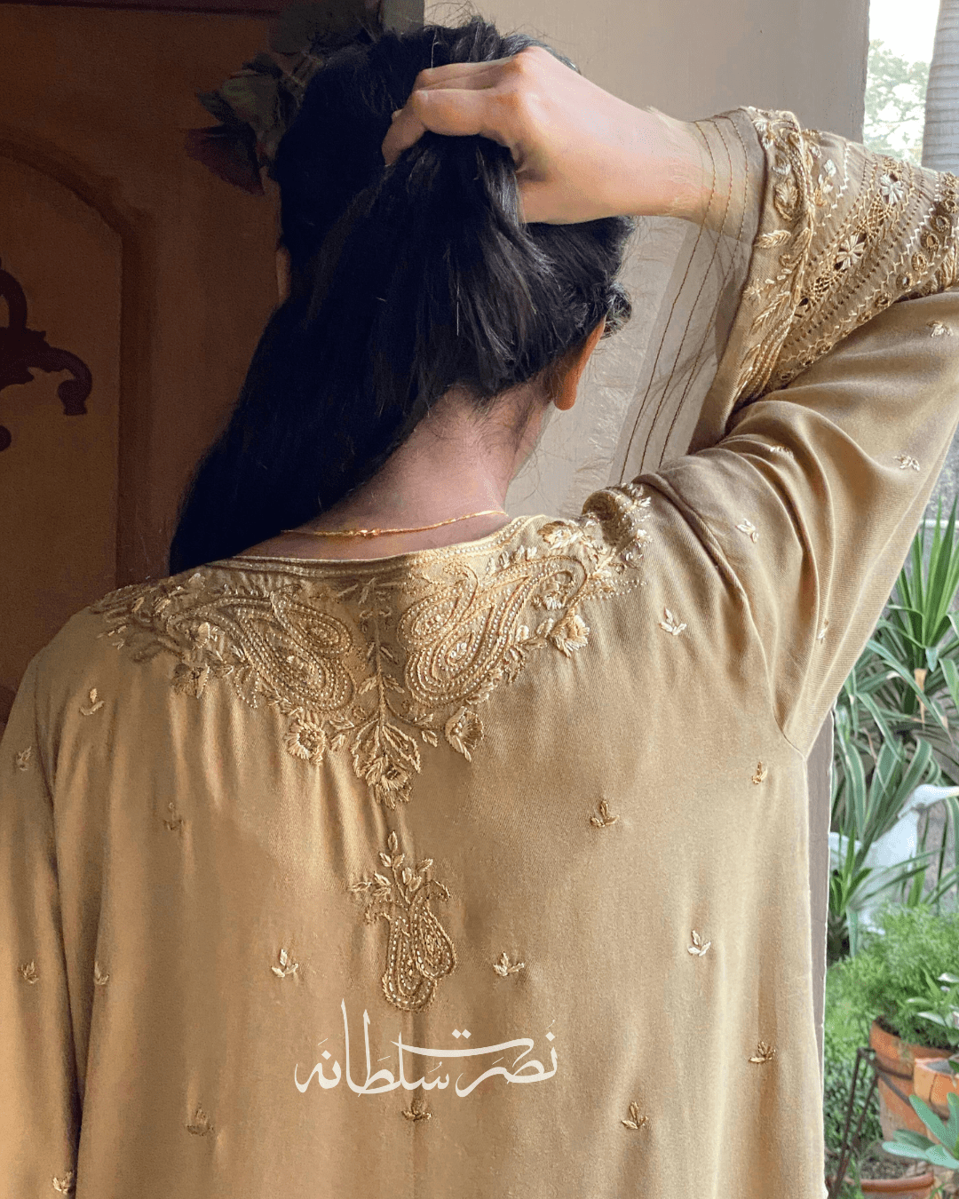 Finished with pure organza detailing and subtle palette work, it highlights the beauty of traditional craftsmanship and the authentic handmade essence of Nusrat Sultana’s collection