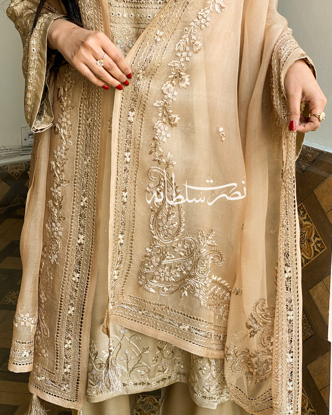 Crafted on pure organza, this warm ivory gold beige dupatta is entirely handmade and detailed with tarkashi work on all four sides. Rich hand embroidery is further enhanced with delicate mirror and tukri accents, while heavy paisley bunches frame the borders beautifully, giving it a timeless and graceful presence.